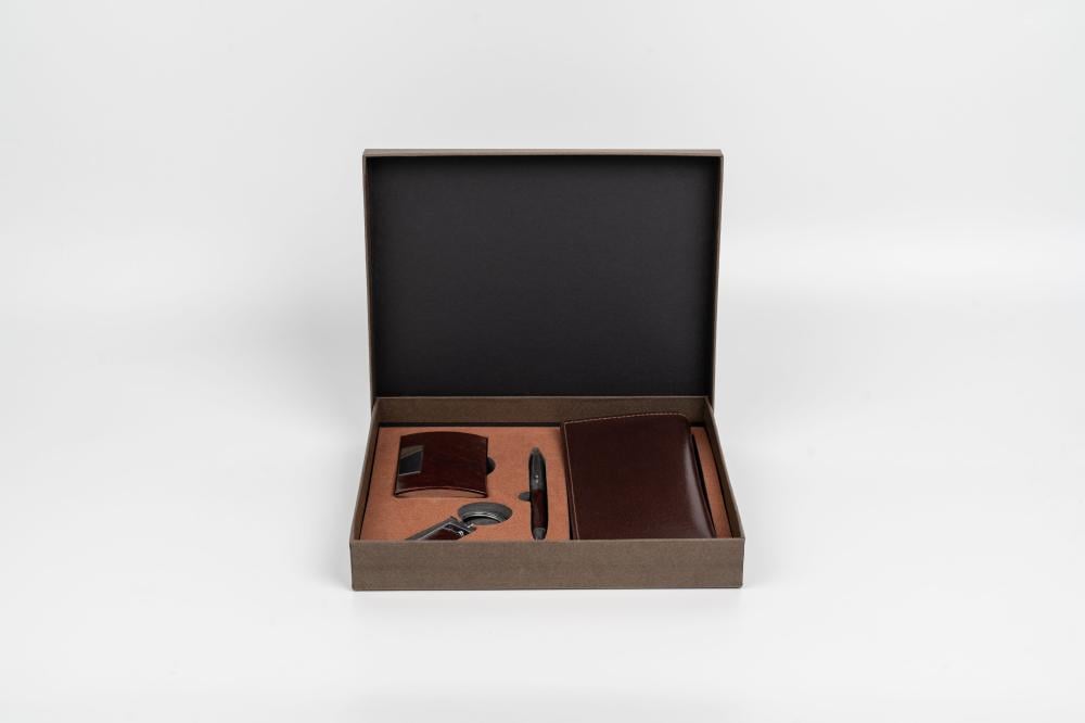 طقم هدايا أنيق يضم محفظة عملية، قلم فاخر، وميدالية مفاتيح بتصميم راقٍ يناسب مختلف الأذواق.